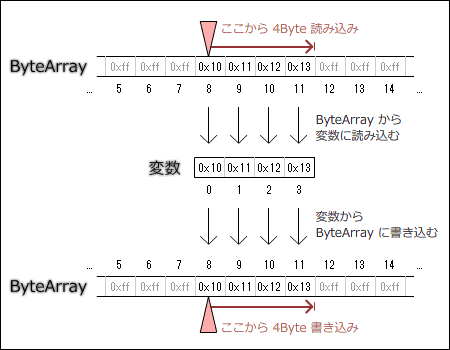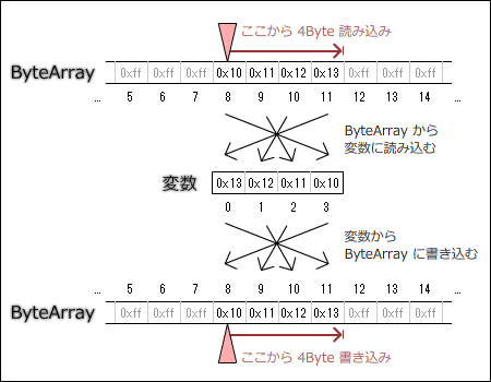 ByteArray のバイトの並びと、実際に変数上に格納される順番が、反転します。