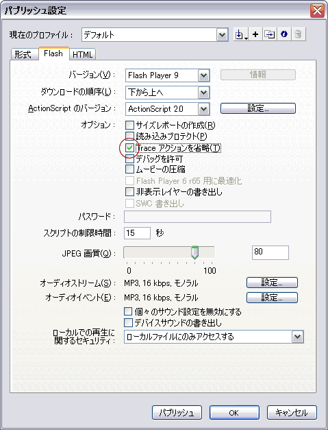 このチェックが付いている場合、書き出された swf ファイルに trace 関数を呼び出す処理が取り除かれます。