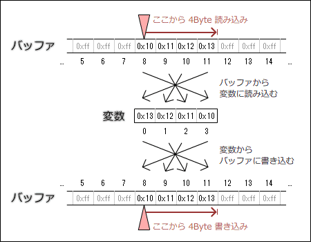 バッファのバイトの並びと、実際に変数上に格納される順番が、反転します。