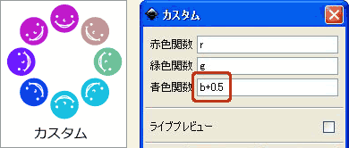 下記のように、[青色関数]をb+0.5とすると、Bの数値に、「255(最大値)×0.5=128」が加算されます。
