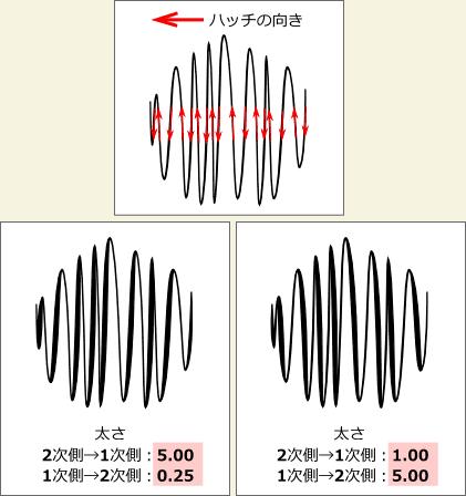 [2次側→1次側]は上から下へ進む部分、[1次側→2次側]は下から上へ進む部分の太さを変化させます。