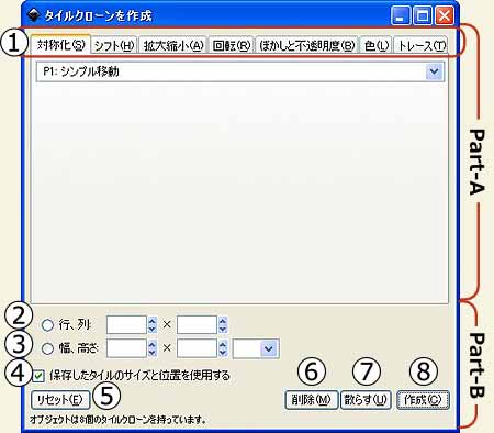 メニューバーの[編集]メニューから[クローン]-[タイルクローンを作成]を選択すると[タイルクローンを作成]ダイアログが表示されます。このダイアログを使って選択中のオブジェクトのタイルクローンを作成します。