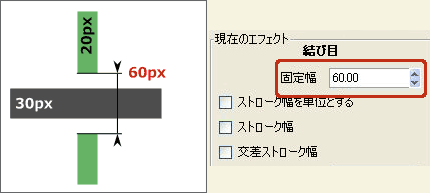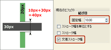 例えば、[固定幅]が10.00で[交差ストローク幅]がONなら・・・