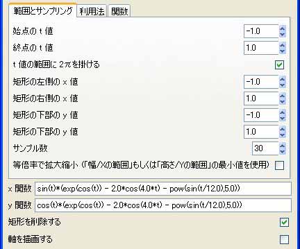 Inkscapeのマニュアルサイトで紹介されていた例を、そのまま[x関数][y関数]の欄にコピペして作ってみました。