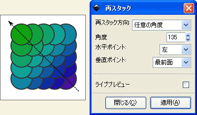[再スタック方向]を[任意の角度]に設定して、[角度]を[135]に設定すると、135度の方向に向かって円が積み重なっていきます。