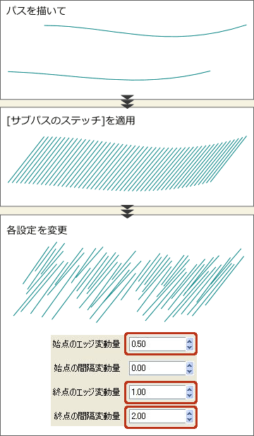 ステッチパスを湾曲させたとき、[幅の基準]の値よってサブパスの変化のしかたが変わります。