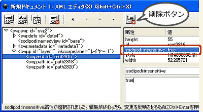 上記の[ロック]の場合と同様に、[XML エディタ]を使います。リスト上で選択すると、隠れているオブジェクトでも選択状態になります。