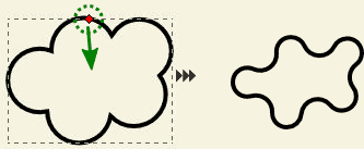 を選択すると、パスの下に『リンクオフセット』という種類のオブジェクトが新たにできます。『リンクオフセット』オブジェクトは、『ダイナミックオフセット』オブジェクト同様ノードがなく、オフセットハンドルが一つ付き、ドラッグでオフセット/インセットできます。この『リンクオフセット』オブジェクトは元のパスとリンクしていて、元のパスの形状を変えると、連動して形状が変わります。