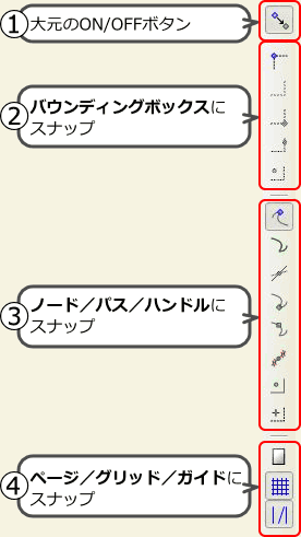 スナップバーはスナップの対象によって4つのセクションからできています。複数のボタンを同時に選択できます。
