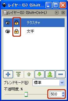 ]レイヤーの不透明度を50%に設定します。