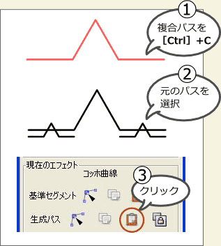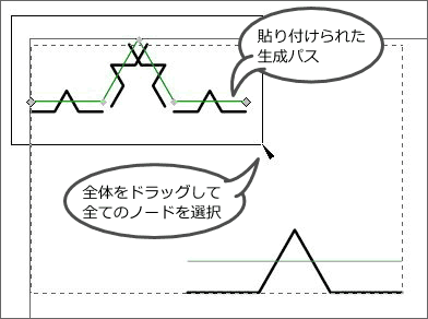流れとしては、1~2で土台を作り、3~4で生成パスの元を作り、5~9で[コッホ曲線]を適用&編集する、という感じです。