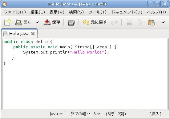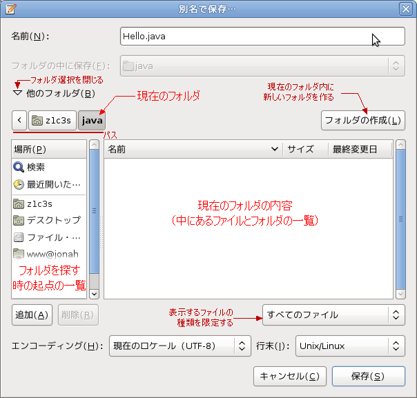 で保存します。保存の時には「名前」だけでなく「保存場所」が大切。[プログラミング]-[Java]で開いたエディタなら黙っていてもjavaというフォルダに保存されるはずですが,「フォルダの中に保存」の所に「java」とあるのを確認してください。名前には「Hello.java」と入力して保存します。LinuxではそしてJavaプログラムでは大文字・小文字の区別をしますから慣れるまでは特に注意。