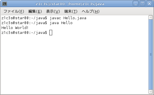$ はプロンプトです。実際には z1c3s@star00:~/java$ などとなりますが、設定により変化しますのでこのテキストで書く時には $ だけにします。