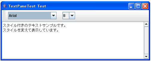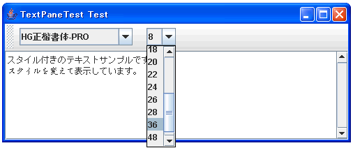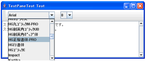 まず手始めにフォントとフォントサイズの変更から行ってみましょう。フォントとフォントサイズはどちらもコンボボックスで選択できるようにします。フォントの一覧はGraphicsEnvironmentクラスのgetAvailableFontFamilyNamesメソッドを使って一覧を取得しています。また指定できるフォントサイズは初期値として指定しています。