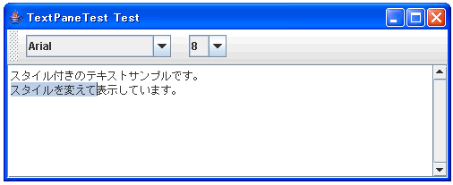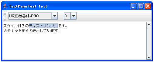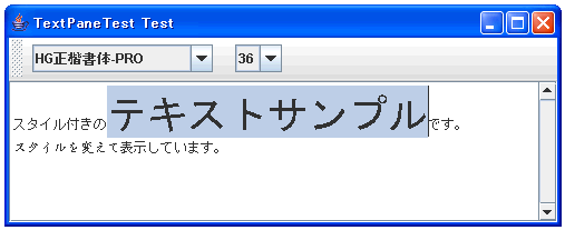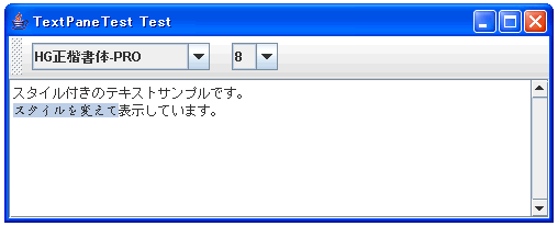 ここでは呼び出されたコンボボックスによって、スタイル情報を持つSimpleAttributeSetクラスのオブジェクト作成し、その後で実際に選択されている範囲の文書に対してスタイルを設定するめのメソッドを呼び出しています。