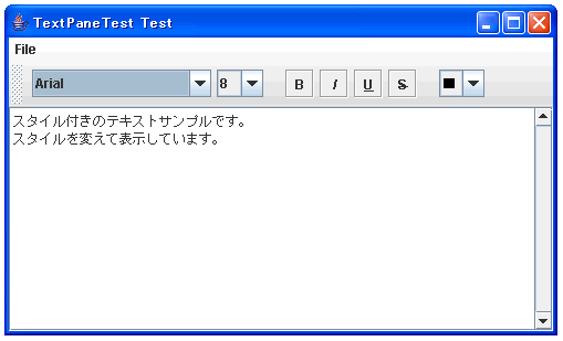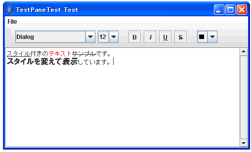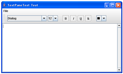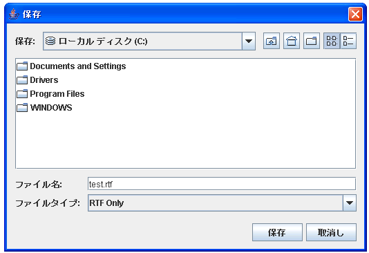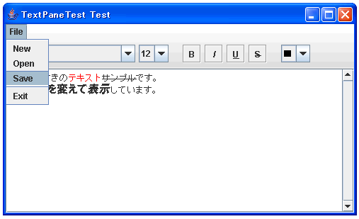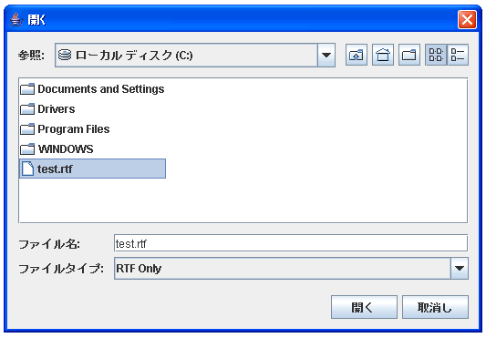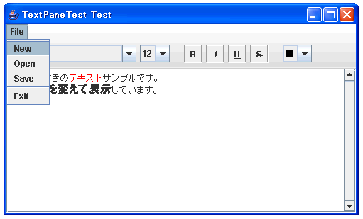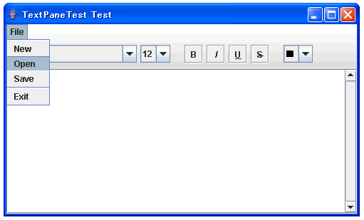 これに新規ファイルのメニューを加えたものが下記となります。詳しくは説明しませんが、ファイルの選択にはJFileChooserクラスとFileFilterクラスを使っています。最終的なファイルとしては、TextPaneTest.javaとRtfFilter.javaの2つのファイルにしました。