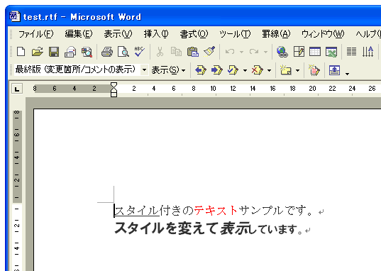 最後にファイルを保存したり、既存のファイルを開いたりします。今回のような書式付きの文書はRTF形式(リッチテキストフォーマット形式)で保存します。RTFはMicrosoft社が策定した、文字の大きさやフォント、字飾りなどの情報を埋め込むことができる文書形式ということです。