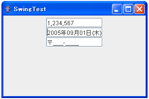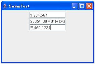 JFormattedTextFieldは入力された数字をコンマ区切りにしたり、また郵便番号など特定のフォーマットに沿って入力を行わせたい場合などに使われます。