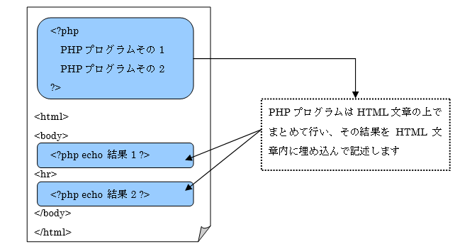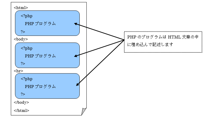 PHPでプログラミングを行う場合図1.1.1のように、HTML文章の間に混在させて記述する方法が一番多い形になります。PHPは元々「HTML埋め込み型」のプログラミング言語なので、このような書き方になるのは当然と言えます。