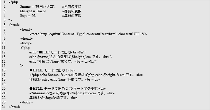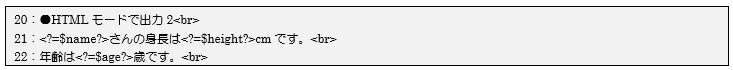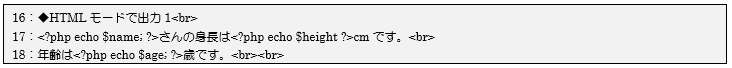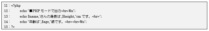 11~15行目はPHPモードから結果を出力するこれまで学習してきた方法になります。