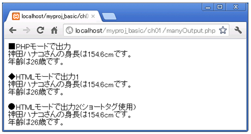 アクセスURL:http://localhost/myproj_basic/ch01/manyOutput.php