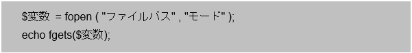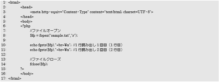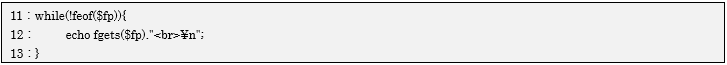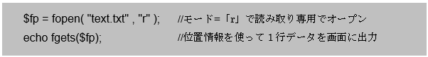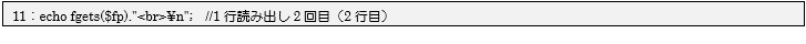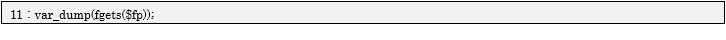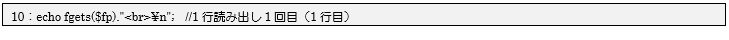 10行目でファイルの位置情報が格納された変数$fpをfgets関数の引数に設定して、オープンしたファイルデータの1行目のデータを取得して画面に表示しています。