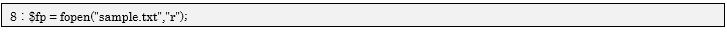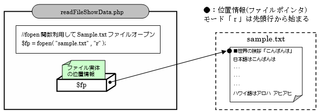 8行目の処理を行うことで、変数$fpがsample.txtのファイル実体の位置情報(ファイルポインタ)を指し示すようになります。
