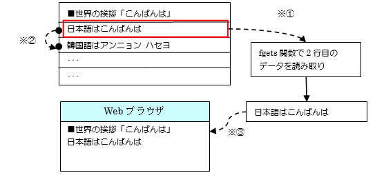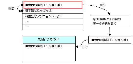 fgets関数は読み出し位置の1行目のデータ(■世界の挨拶「こんばんは」)を取得(※①)して、次の読み出し位置を次の行の先頭に設定(※②)します。そして戻り値として取得したデータ(■世界の挨拶「こんばんは」)を画面に表示します。(※③)