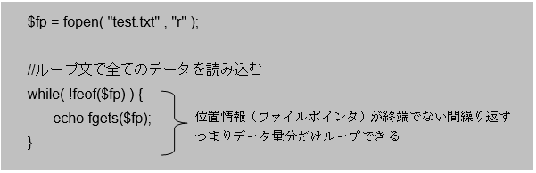 feof関数の引数もファイルオープンした際の戻り値である位置情報になります。この位置情報から現在の位置が終端になっていないか確認してくれます。feof関数の戻り値は終端でなければfalse、終端であればtrueを返すため、whileの条件式では「!」を使って結果を反転させます。そうすると繰り返し処理は終端でなければtrueになり条件式を満たせるため、データ読み出しで終端へ移動するまで継続する仕組みになります。