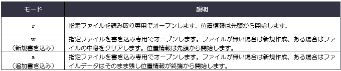 - 読み込みモードでファイルをオープンしたい場合は、第2引数に「r」を設定する。