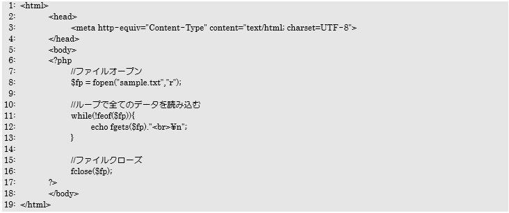 11~13行目で繰り返し処理とfeof関数を組み合わせて、ファイルの終端までのデータを全て読み込む処理を行っています。