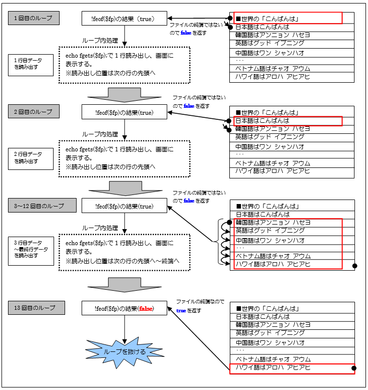 ここで重要なのは「feof関数」の役割です。この関数の役割は読み込んだデータの現在の読み出し位置をチェックし、終端であれば「true」そうでなければ「false」を返してくれます。これを「while文」と組み合わせることで、終端でなければ内部の処理(データ1行読み出して、画面に表示する)を行い、終端であれば繰り返し処理が終わる仕組みになります。そうすることで全てのデータを読み込むことが可能になります。