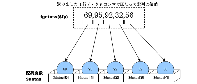 凡例の読み込んだ1行データが「69,95,92,32,56」だった場合のイメージは、以下のようになります。