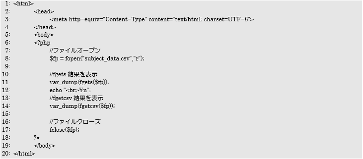 csvファイルをオープンし、fgets、fgetcsv関数の両方で1行データを読み出した場合の違いをWeb画面に表示して確認します。