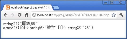 14行目ではfgetcsv関数を使って1行読み出し、その情報をvar_dump関数を使って画面に表示しています。fgetcsv関数は読み出した1行データをカンマで区切って配列データにするので、実行結果から「array(2) { [0]=> string(6) “数学” [1]=> string(2) “78” }」と配列データになっているのが確認できます。