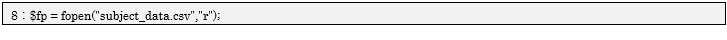 8行目でcsvファイルである「subject_data.csv」を読み込みモードでオープンします。テキストファイルでもcsvファイルでもfopen関数を利用するのは変わりません。