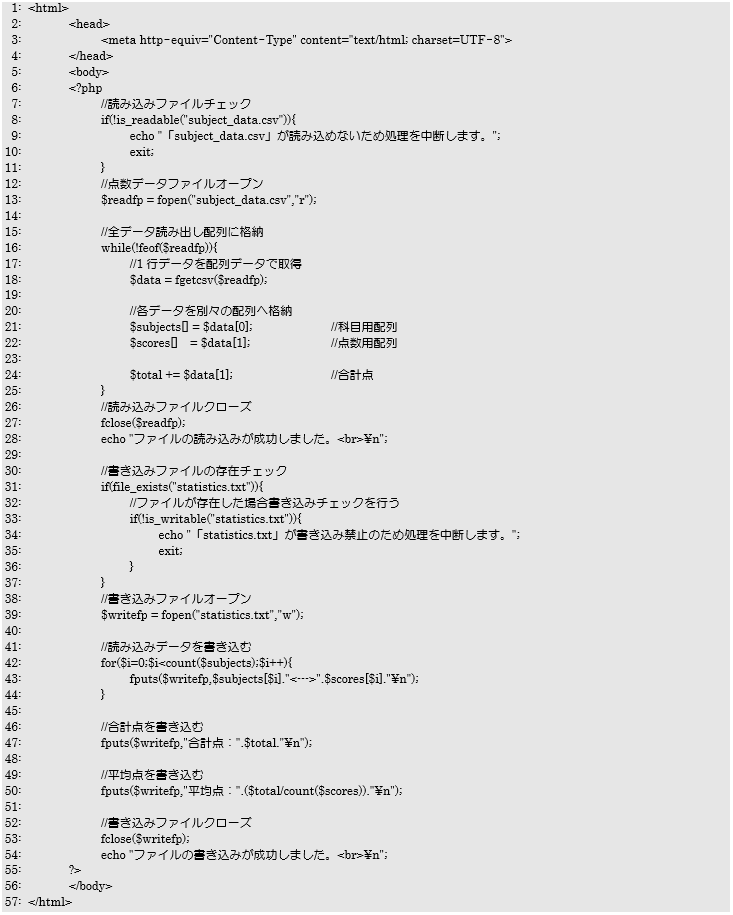 読み込みファイルのチェック同様に34行目でエラーメッセージを表示し、以降の処理を行わないように35行目でexit関数で強制終了させています。
