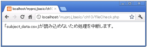 例えば10.3.2項で作成した、「fileInOutData.php」を実行する時に、「subject_data.csv」が無い場合や、または「statistics.txt」が読み取り専用になっている場合はエラーになってしまいます。