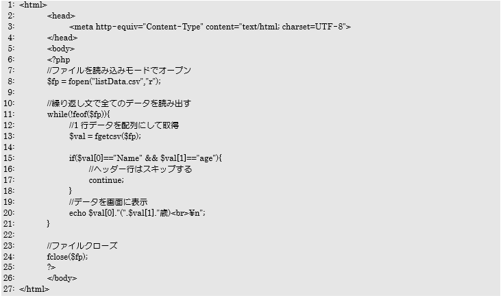 13行目でファイルの1行データをfgetcsv関数を使って配列データとして取得しています。