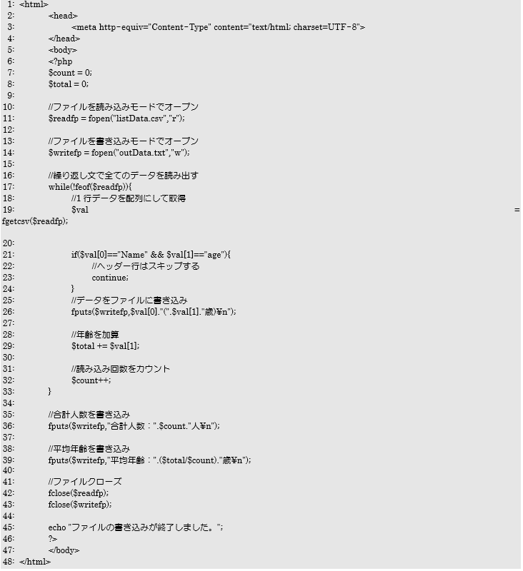 11と14行目で読み込みファイルと書き込みファイルのオープンを行います。17行目で読み込んだファイルデータを繰り返し文を使って全て読み込みます。その繰り返し内では、ヘッダー行を読み飛ばし、各読み込んだ1行データを「名前(年齢)」の形式で書き込んでいきます。その際に、29行目で変数$totalに年齢データを加算し、32行目で変数$countをインクリメントしていきます。