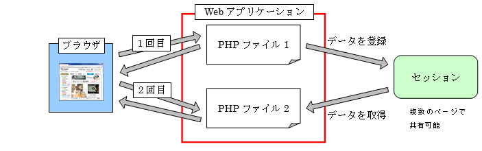 セッションを簡単に説明すると「サーバ内に情報を保存し、複数ページ間で共有する」仕組みのことです。