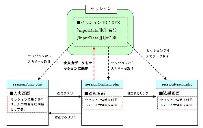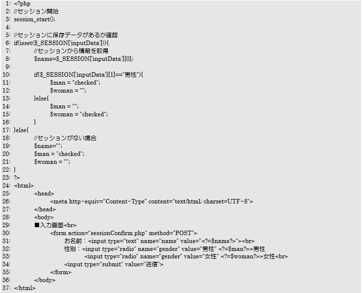 上記の図を参考に各ファイルのソースコードについて、詳しく解説していきます。まずは入力画面の「sessionForm.php」です。