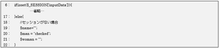 6~22行目はisset関数を使ってセッションに情報が保存されているか確認しています。保存されているセッション情報には$_SESSION[‘キー文字列’]でアクセスできます。ここでセッションの情報があればifブロックの処理を、無ければelseブロックの処理を行い、入力画面の表示用の各変数に初期値を代入します。※セッション情報の保存は別画面の「sessionConfirm.php」で行われます。