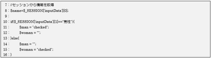 10~16行目はセッションに格納された配列データ(添え字1)から、性別の情報を取得してラジオボタンのどちらかを選択状態にするための条件判定を行っています。男性なら$manに、女性なら$womanに「checked」を設定します。