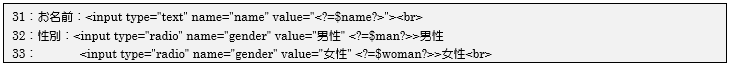 31~33行目でこれまでの処理結果で決まった変数を、ショートタグを使って埋め込みます。type=”text”にはvalue属性に埋め込み、type=”radio”はタグ内に「checked」属性が記述されれば選択状態にすることができます。