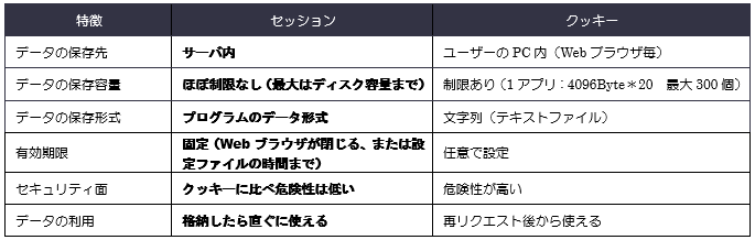 セッションとクッキーの違いを、まとめた以下の表も参考にして下さい。