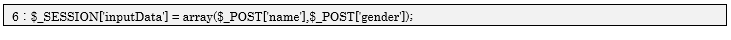 6行目でスーパーグローバル変数$_SESSIONを使い、入力画面からのPOSTデータ(名前と性別)を配列データで保存しています。保存する際のキー文字列は「inputData」にしています。これは、データを取得する際にも利用するため間違えずに覚えておく必要があります。