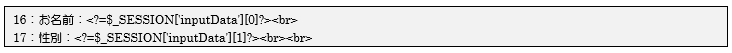 16、17行目ではセッションに保存した入力情報を利用して、確認用のデータとして画面に表示しています。クッキーとは違いセッション情報は保存してすぐ利用できます。