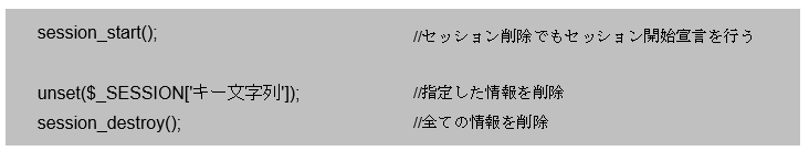 unset関数は引数で指定した変数を削除してくれるので、任意のセッション情報を削除することができます。session_destroy関数を利用すると、全ての情報をまとめて削除してくれます。