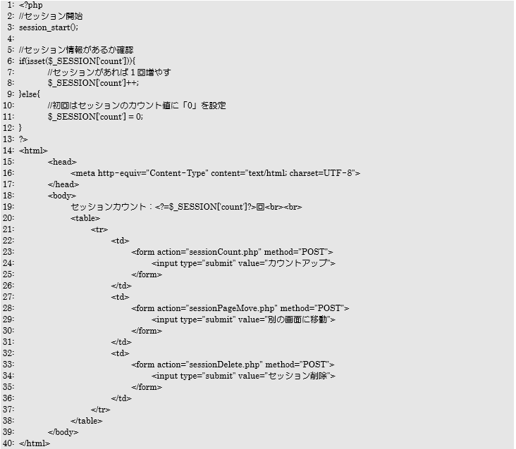 まず「sessionCount.php」はセッションを利用するため、3行目でsession_start関数を利用します。